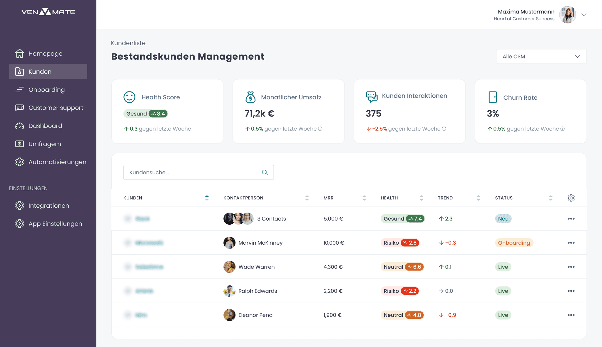 VENMATE schafft eine zentrale Sicht auf Kunden, Umsatz und Nutzung, damit Churn reduziert und Customer Success planbar wird.